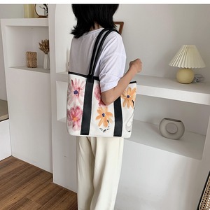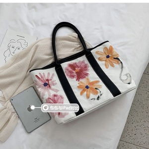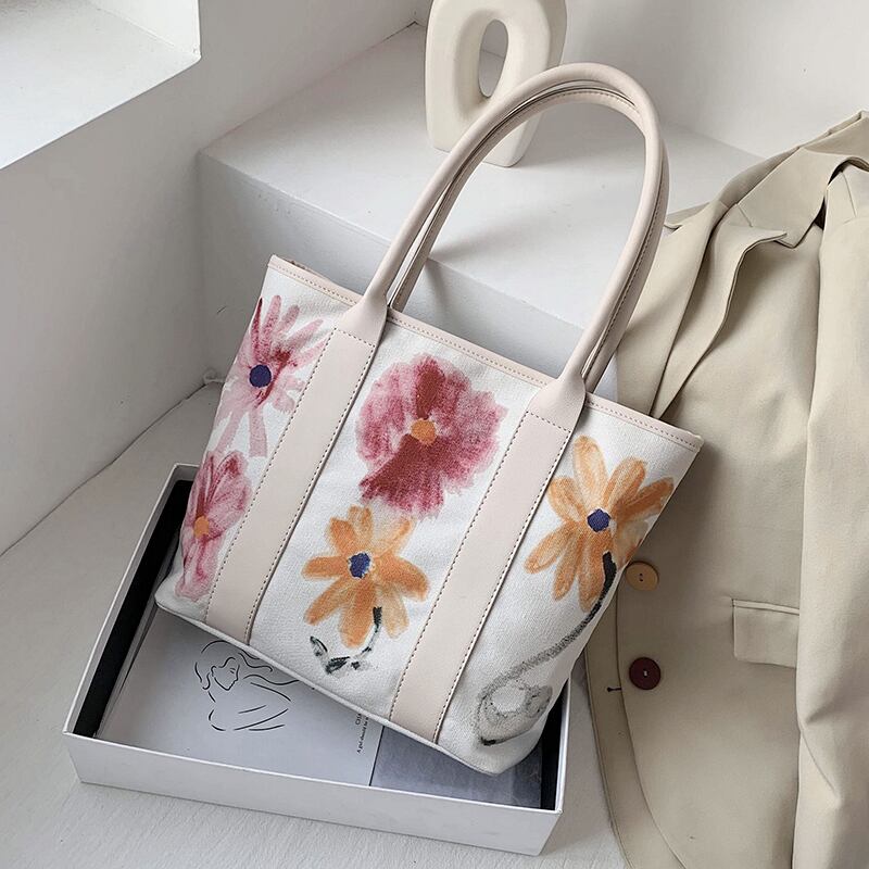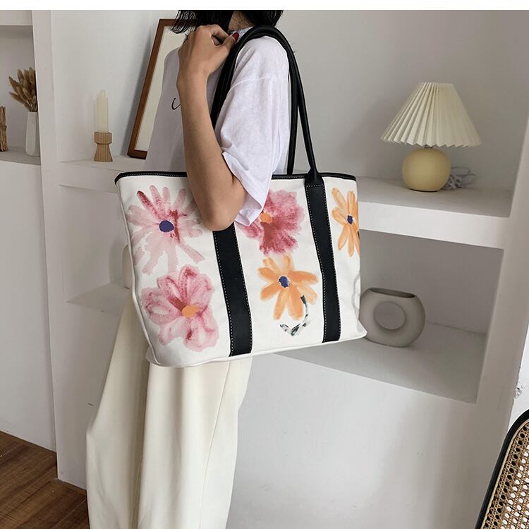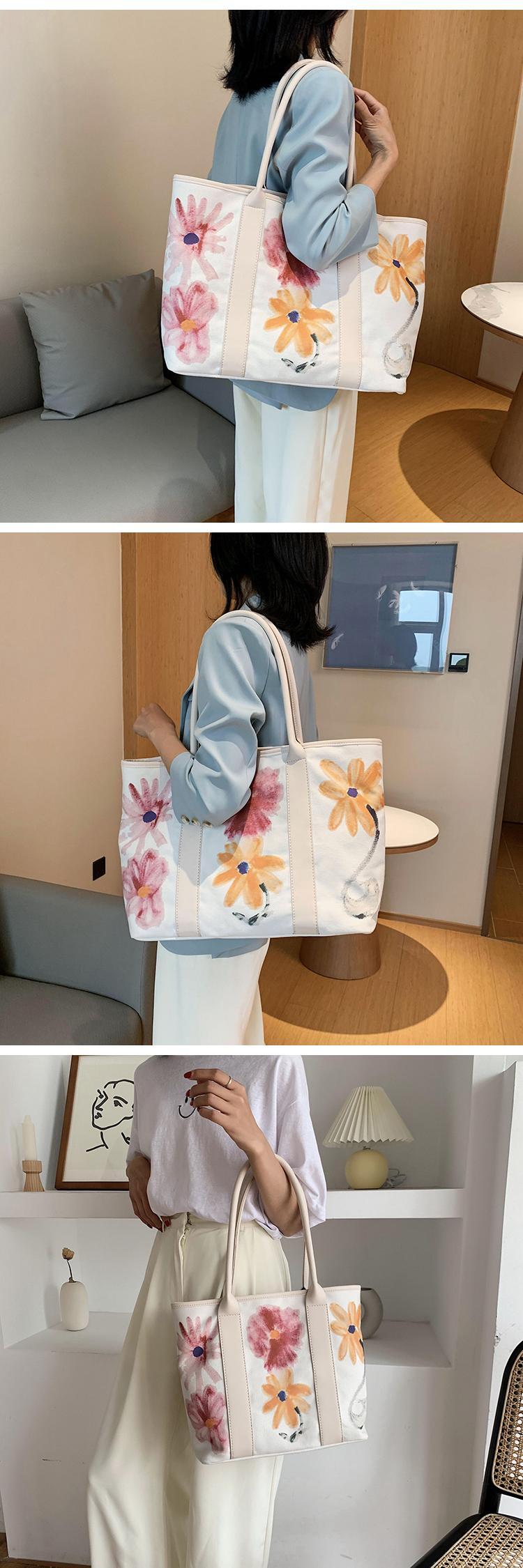 シンプルな大容量バッグレディース2020人気の新しいワイルドキャンバスショルダーバッグネット赤い花落書きホリデーバッグ 手作りハンドバック62234773995